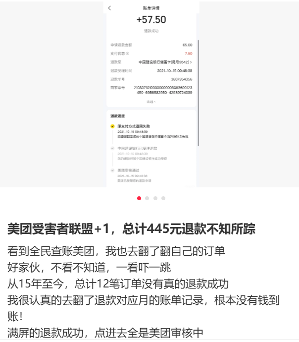 针对第一类问题,主要是平台退款进程信息展示滞后,导致用户误解。目前,产品技术团队已优化信息展示,2017 年之后的订单,用户刷新即可自主查询到账去向,而 2017 年以前的历史订单,可通过客服查询。具体而言,有的退款已到账,页面却显示 “审核中”“处理中”,这是订单信息更新不及时,美团现已修复,用户刷新就能收到 “到账” 通知;有的退款到账但金额显示为 “0”,是系统信息更新错误,用户可通过原支付渠道查账单;还有的退款显示成功,原支付渠道却查不到,可能是原支付渠道异常,款项已退回美团账户余额,也可能是用户查询渠道有误。